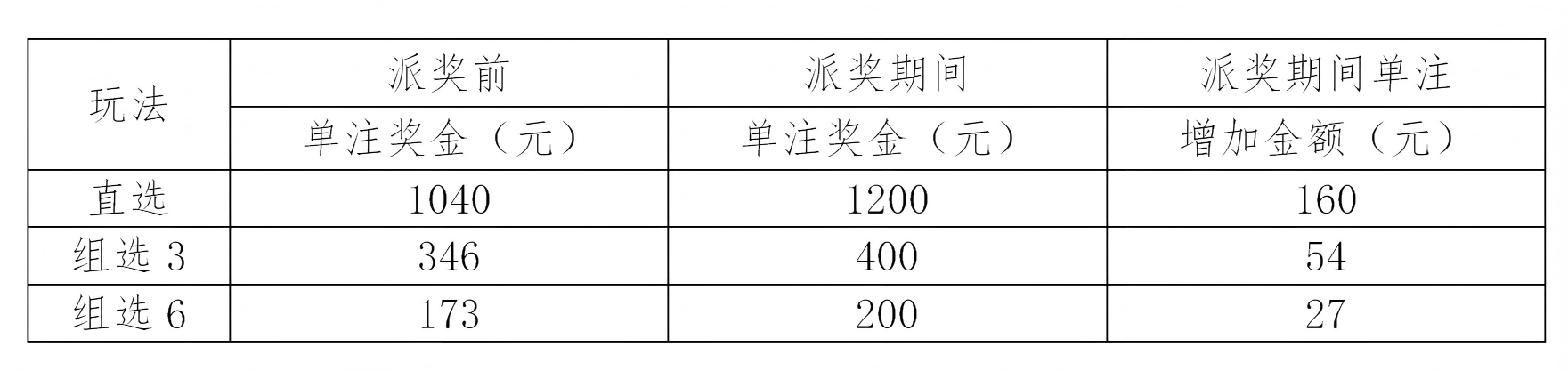 (二)本次活动对排列3游戏中的直选、组选3、组选6玩法采用固定奖加奖方式进行派奖,具体如下: